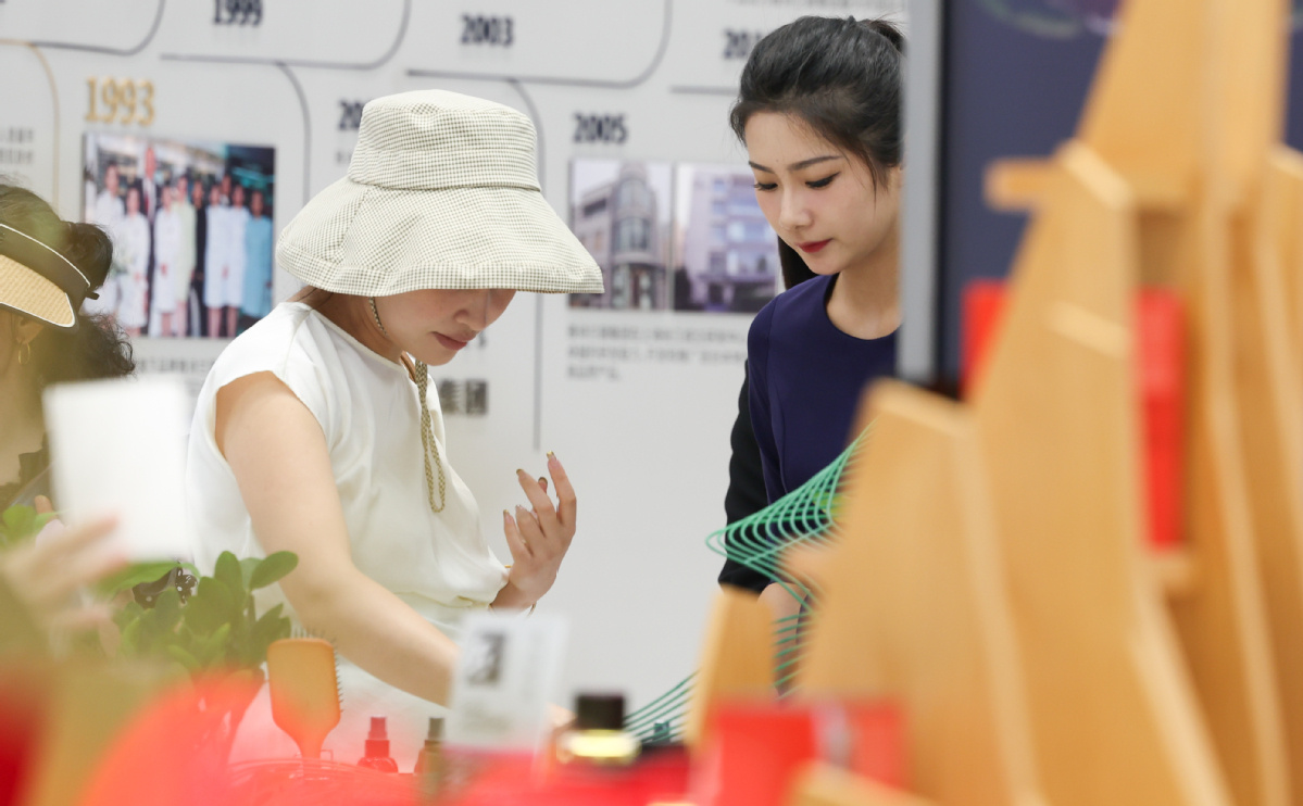 2024年4月15日,参观者在中国南方海南省省会海口市举行的中国国际消费品博览会上挑选产品。[图片/新华社]