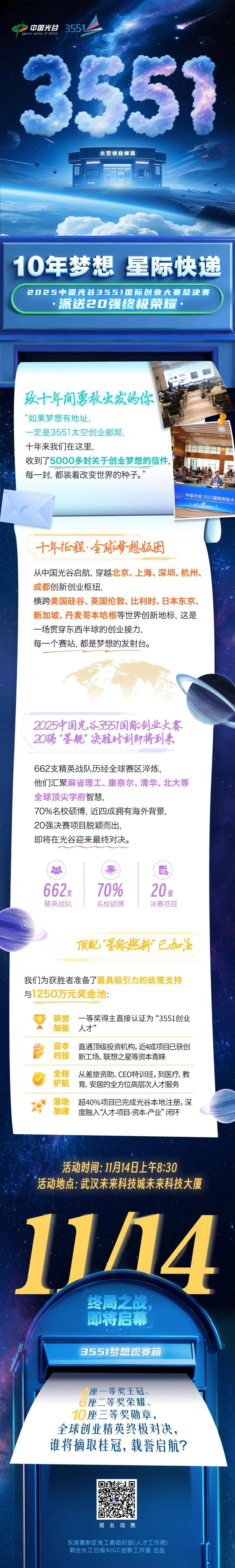 湖北日报讯(通讯员 董新才)上午8时30分11月14日,2025中国光谷3551国际创业大赛决赛将在武汉未来科技城未来科技大厦二楼多功能厅举行。来自麻省理工学院、康奈尔大学、清华大学、北大等世界知名大学的顶尖企业家将在比赛舞台上追逐梦想。 4枚一等奖牌、6枚二等奖牌、10枚三等奖牌以及1250万元奖金等你来拿!全球商界精英的终极对决,谁将摘得桂冠,扬名扬帆? 2025中国光谷3551国际创业大赛报名自今年5月启动以来,已报名境内及电商项目662个。项目数量较往年大幅增加。超过一个第三,拥有国际经验和博士学位。随着众多国内外项目的涌入,光谷产业诱人的轮廓正在悄然被勾画出来。从人工智能赋能千行百业,到生命科学和健康保障技术,从可持续绿色能源发展,到开创虚拟宇宙新维度……10年来,航天企业家邮局3551收到超过5000封充满梦想的商业信函,400个项目在光谷落地,孵化了4家专业创业公司和20家瞪羚企业。五年来,已有22家企业获得股权融资,贷款金额近20亿元。